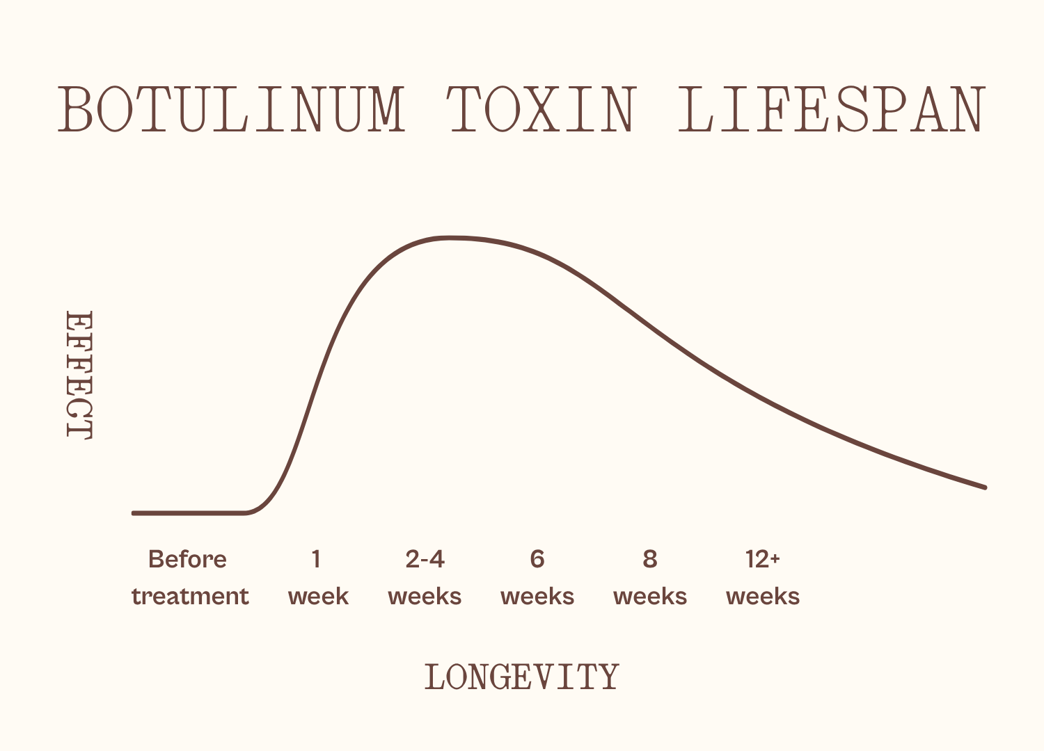 Onset, peak effectiveness, and longevity of your neuromodulator treatment will vary depending on your treatment area, drug, dose, anatomy, metabolism, and treatment history. Your clinician will guide you on what to expect for your specific treatment.